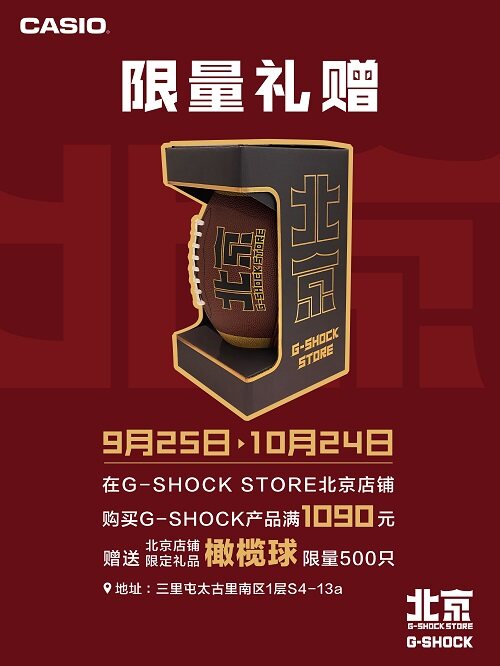 没能第一时间到场感受G-SHOCK硬核潮流的小伙伴也不必遗憾,G-SHOCK还准备了众多惊喜等你Get!9月25日至10月24日,凡在G-SHOCK STORE北京店购买 G-SHOCK 产品满1090元,即可获赠北京店铺限定礼品橄榄球一个,限量仅500只,先到先得!